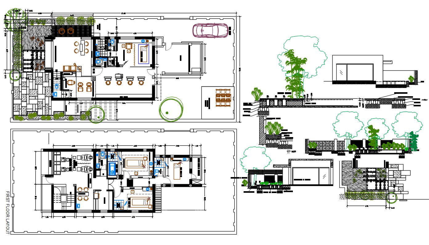 Architecture Salon Floor Plan With Landscaping Design AutoCAD File; the architecture saloon ground floor and first-floor plan with all furniture detail CAD drawing shows reception area, facial room, waxing area, threading, hairwashroom, manicure, and spa unit. download AutoCAD file of salon project CAD drawing and get more details with artistry landscaping design.