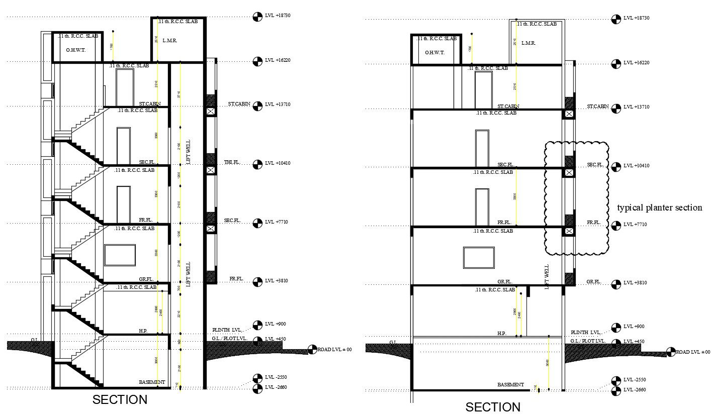 Architecture Office Building Section CAD Drawing Free Download; 2d CAD drawing of architecture office building section detail shows basement, ground floor and 4 storey building wall and RCC slab with dimension detail in AutoCAD format.