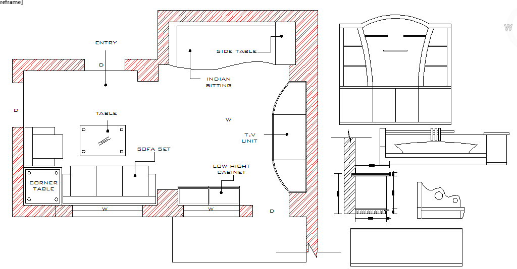 Drawing Room Lay-out Design in low hight cabinet, T.V unit, Table, Sofa Set, Center table, Side Table, Etc furniture design.