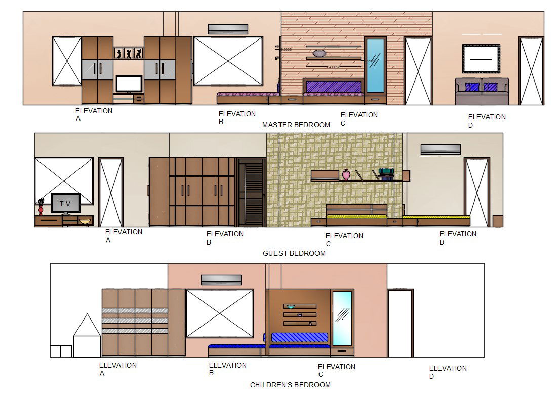 Bedroom Interior Design Elevation View AutoCAD File; The interior design of master bedroom, guest bedroom, and children's bedroom with all side elevation design and furniture detail shows double bed, cupboard, and tv unit. download AutoCAD file of bedroom interior design CAD drawing.