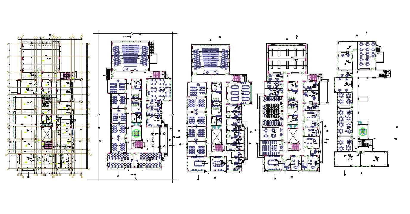 DWG Drawing All Floors Plan Of Art College With Working Design AutoCAD File; this is all floor plans of art college includes furniture playout, centerline, working dimension, cutout design in plan, all floor is related to a different function, this is the CAD file format.
