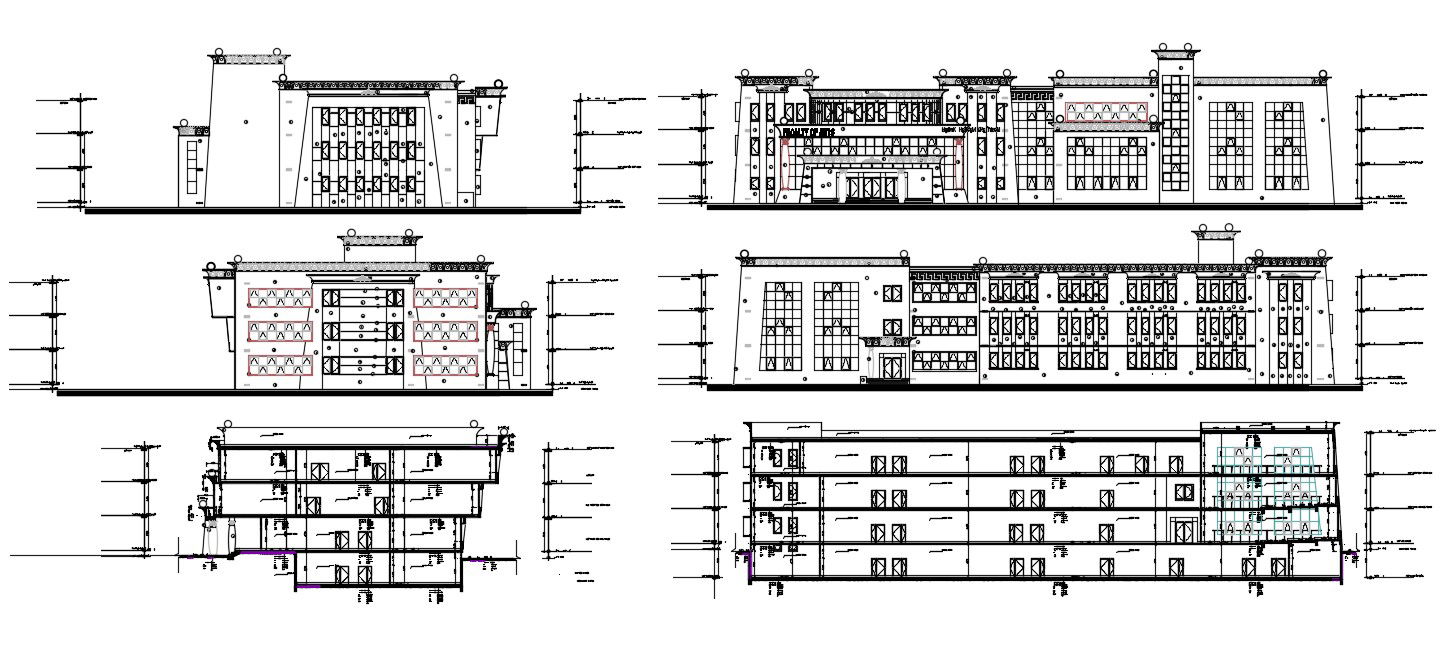 Elevation And Section Of Art College With Working Dimension AutoCAD File; this is the four side elevation of the art college building and two-section details, in this drawing added floor dimension details, railing design, door, and windows design, structure details in both section, this is the DWG file format.