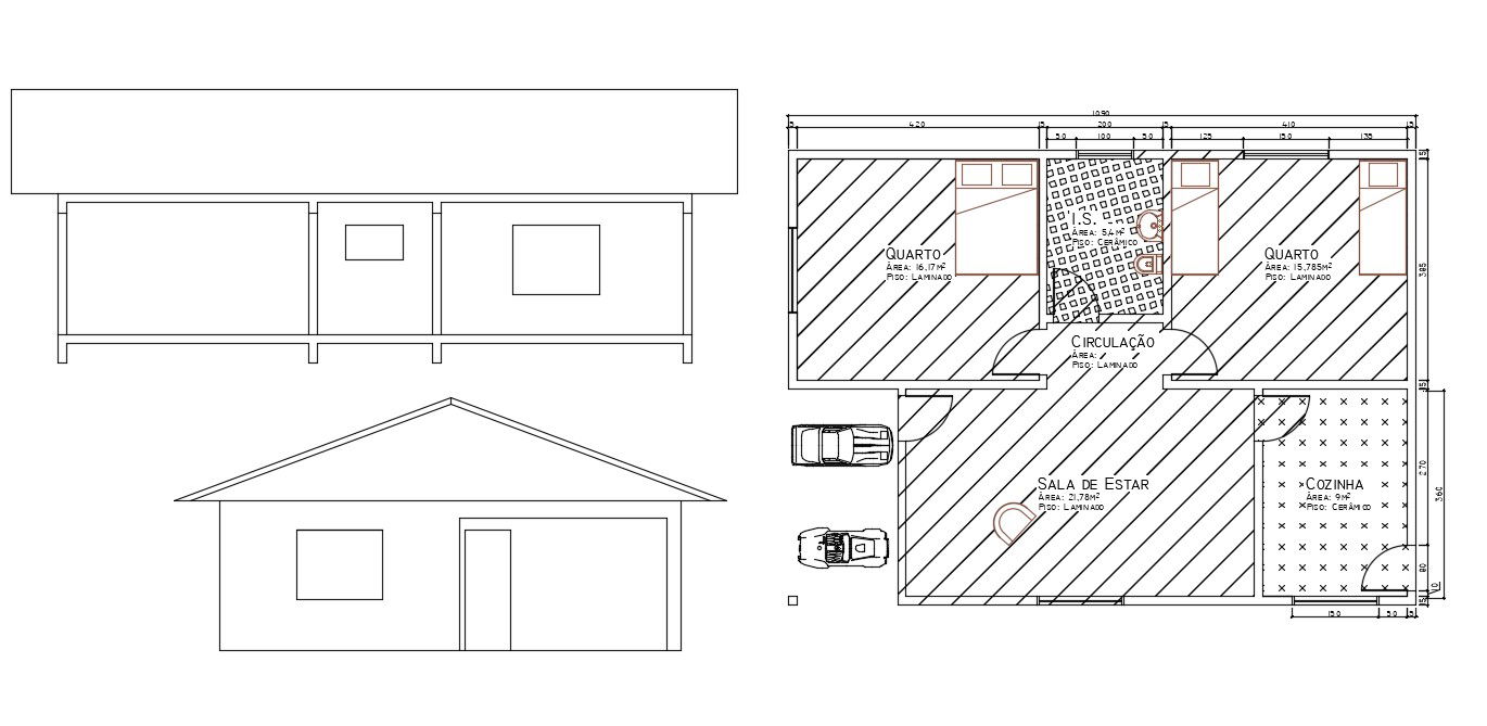 Free Download Simple House Plan Elevation And Section Design AutoCAD File; this is the planning of the house includes sloping roof elevation and section details, and parking space in front of the house, its a CAD file format.