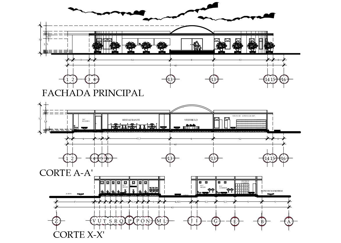 AutoCAD Drawing Of Restaurant Elevation And Section Design DWG File; this is the drawing of the restaurant elevation and two sections include centerline details, interior furniture in the section design, working dimension details, floor levels dimension and much more other details related to elevation and section, this is the CAD file format.
