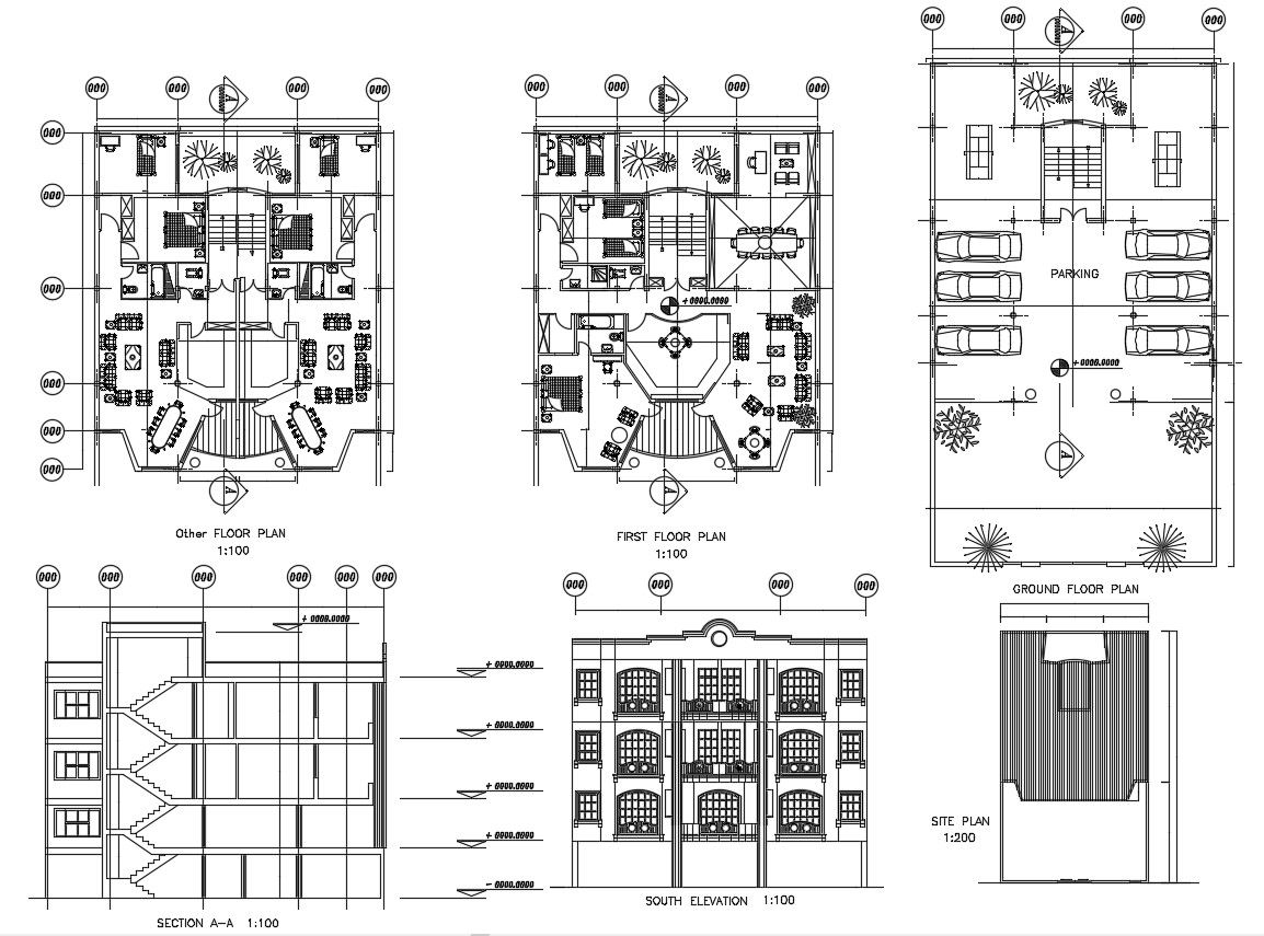 AutoCAD Drawing Of Huge Bungalow With Furniture Layout and Elevation section DWG File; this is the huge bungalow planning with all floor plans, site plan, elevation, and section details, ground floor is used as parking, drawing room, kitchen, dining, bedrooms attached toilets,stairs, and plantation in the home, column balcony, and much more other details related to planning, its a CAD file format.
