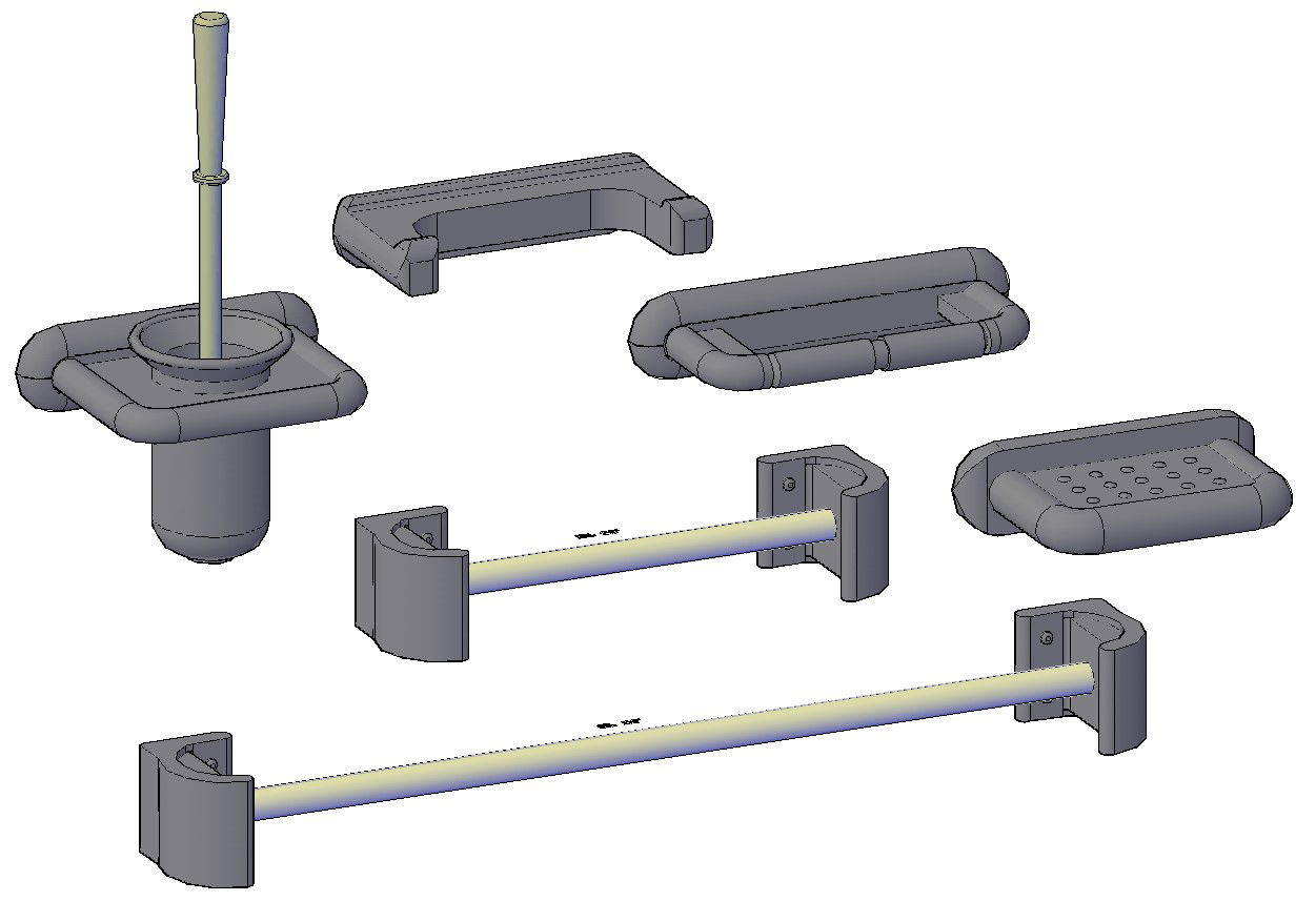 3D Drawing Of Bathroom Wall Mounted Hardware Model Elevation Design; download free DWG file of bathroom wall mounted towel holder and soap isometric elevation design CAD blocks.