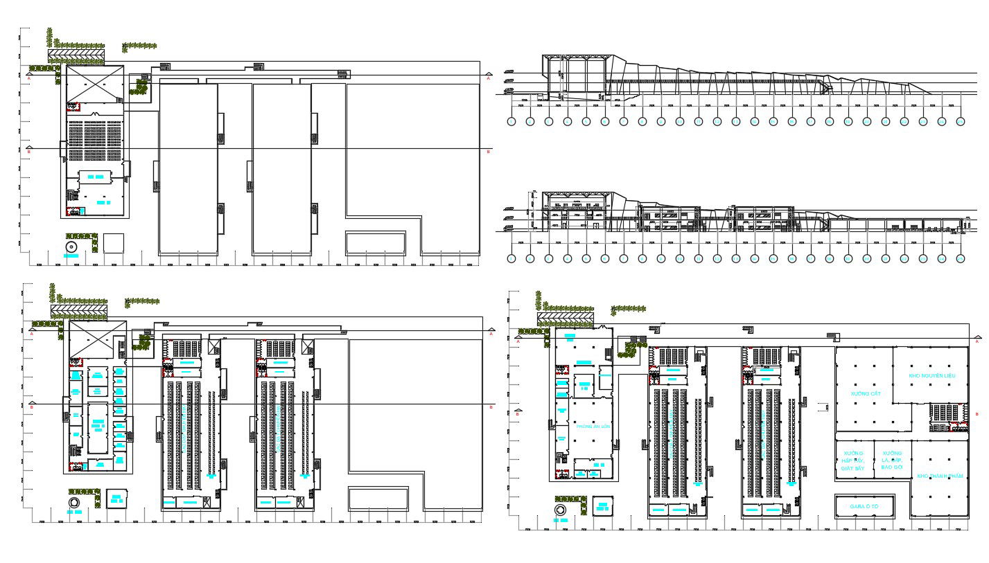 2D CAD Drawing Of Factory Project Layout Plan And Elevation Design AutoCAD File; 2d CAD drawing of architecture factory layout plan CAD drawing shows beam layout plan, production department, storage room, communicated auditorium hall, financial department, sales shop, section and elevation design in AutoCAD format. download DWG file of architecture factory project CAD Drawing.