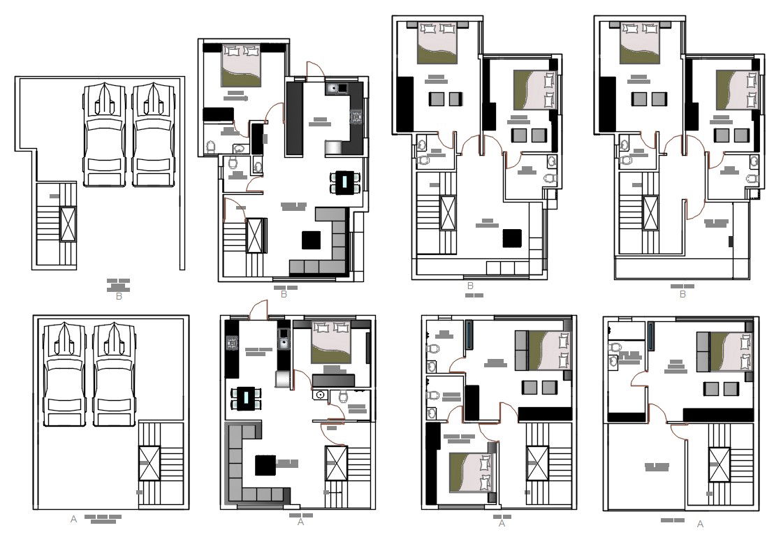 5 BHK Luxurious Bungalow Furniture Layout Plan AutoCAD File; The architecture bungalow furniture layout plan CAD drawing shows different floors includes parking lot, modular kitchen, drawing room, dining area, family loung, and 5 bedrooms. download AutoCAD file of bungalow project with 2 different size plots A and B.