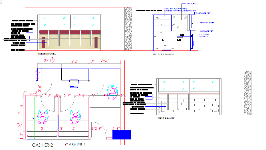 Cash Counter Design in Front side Elevation & Section side elevation, & Plan Lay-outt design.
