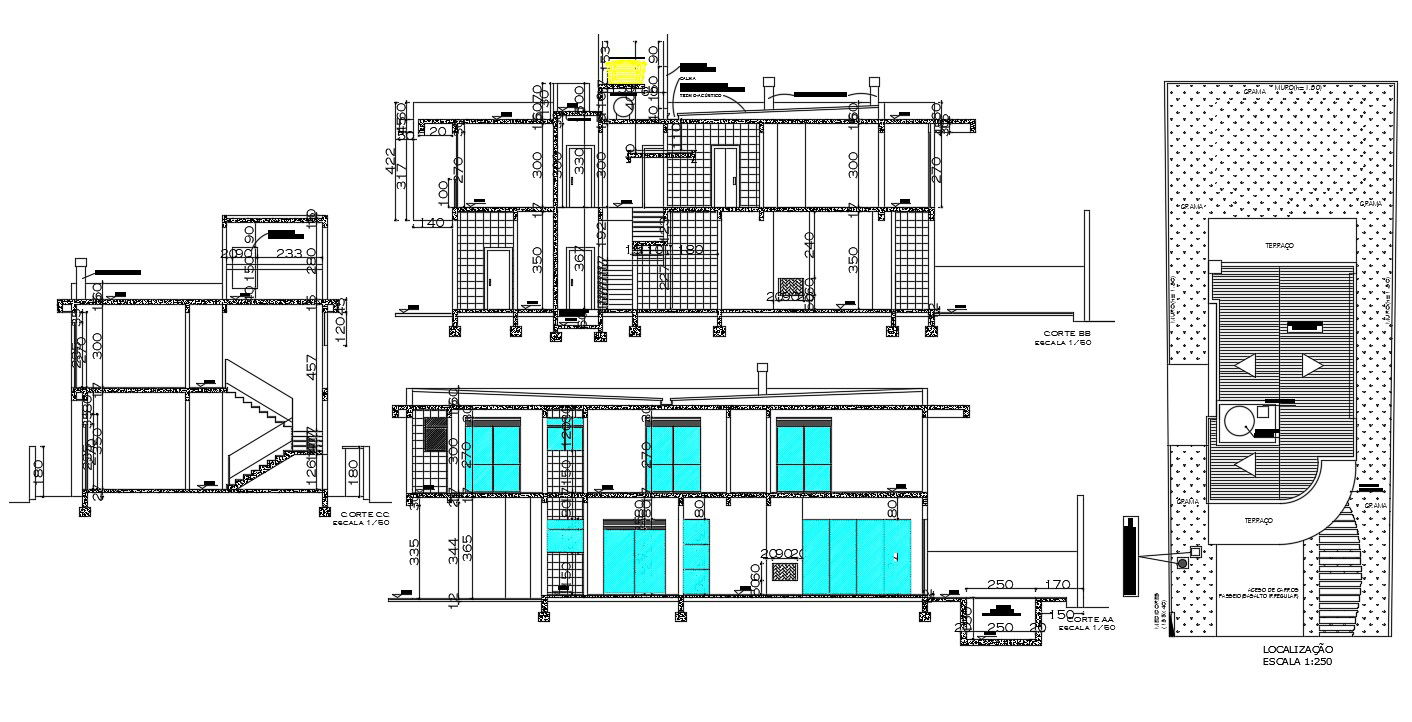 CAD drawing details of residence bungalow section drawing that shows different section view of G+1 bungalow along with residence area planning, leveling, bungalow height, staircase, and various other units details download AutoCAD file.