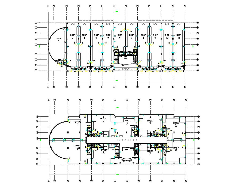 AutoCAD Drawing Of Two Commercial Floor Plan With Centerline DWG File; this is the two floors plan of a commercial building with the centerline, working drawing dimension, texting details, in this plan added shops , offices, stairs , lifts toilet blocks for his and her and its a CAD file format.
