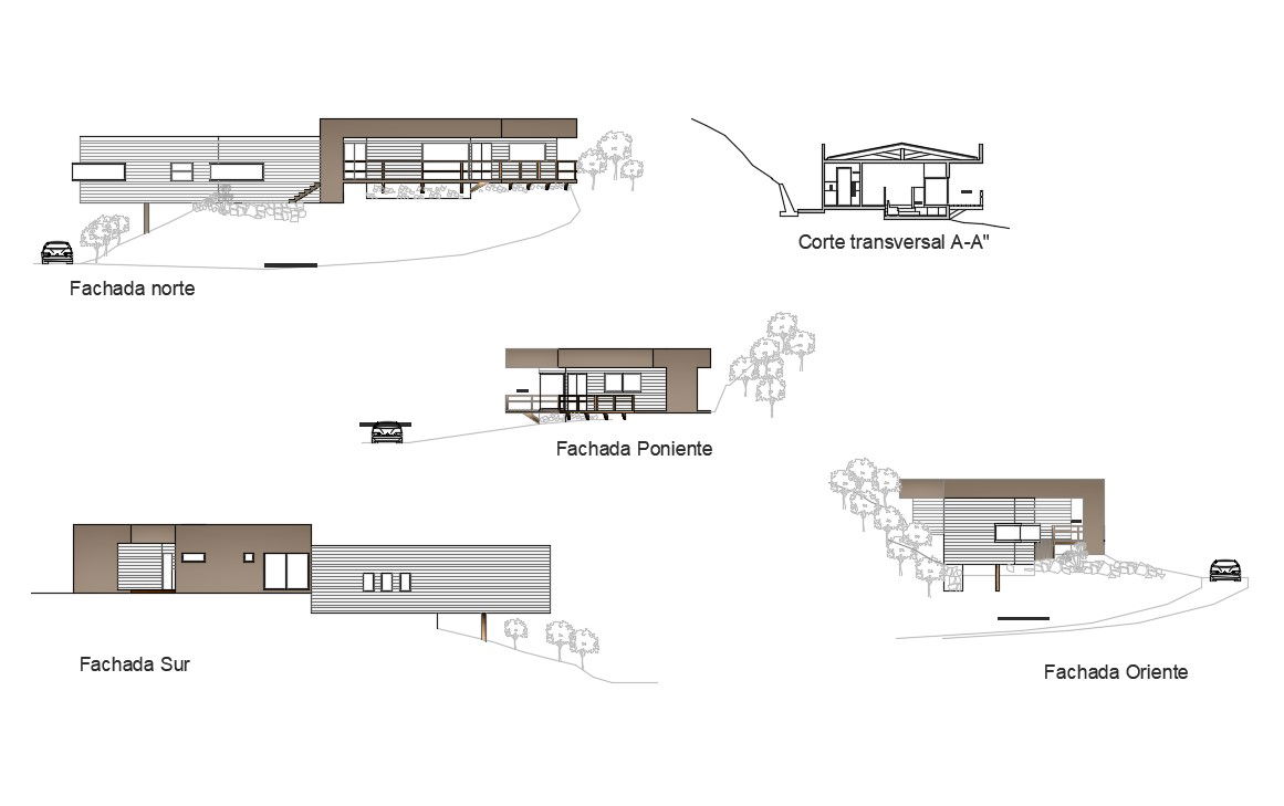 2D CAD Drawing Four Side Elevation Of Bungalow With Section AutoCAD File; this is the modern elevation of the bungalow with section , it's a modern elevation with basic rendered drawing, some landscape details, parking design and other more details in it, its a DWG file.