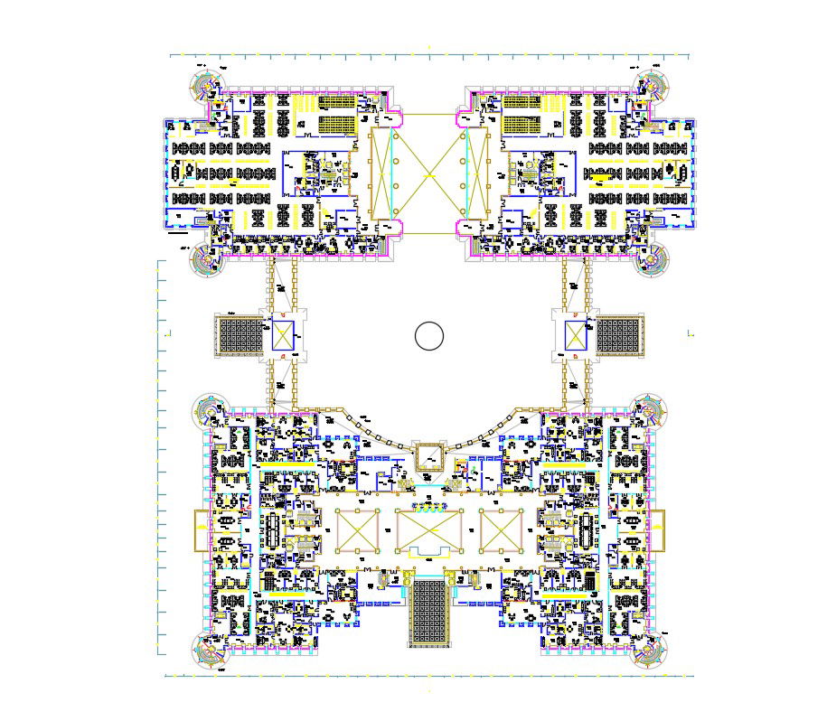 Residential And Office Building Floor Plan With Furniture Layout AutoCAD File; this is the floor plan of a residential and commercial office building with fully furnished, in this plan three-block is for office and one is for residential, it a Huge Building floor plan and CAD file format.