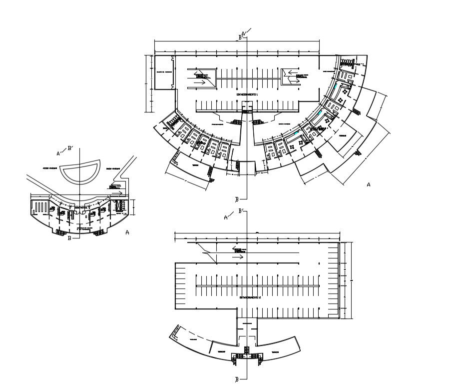 AutoCAD Drawing Commercial Building Floor Plan With Parking 2D CAD File; this is the planning of commercial building with some furniture layout , texting details, working dimension details, section line on the plan, ramp location and much more other details related to building, its a DWG file format.