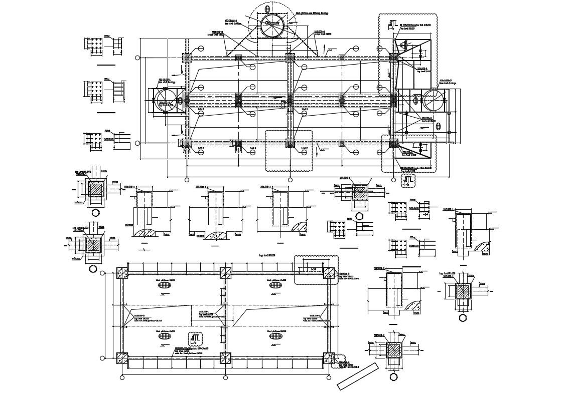 2D CAD File Column Foundation Design With Plinth Beam Section AutoCAD Drawing; this is the column foundation detail with some texting details and beam design, steel platform in the plan, some bars joint details, its a DWG file format.