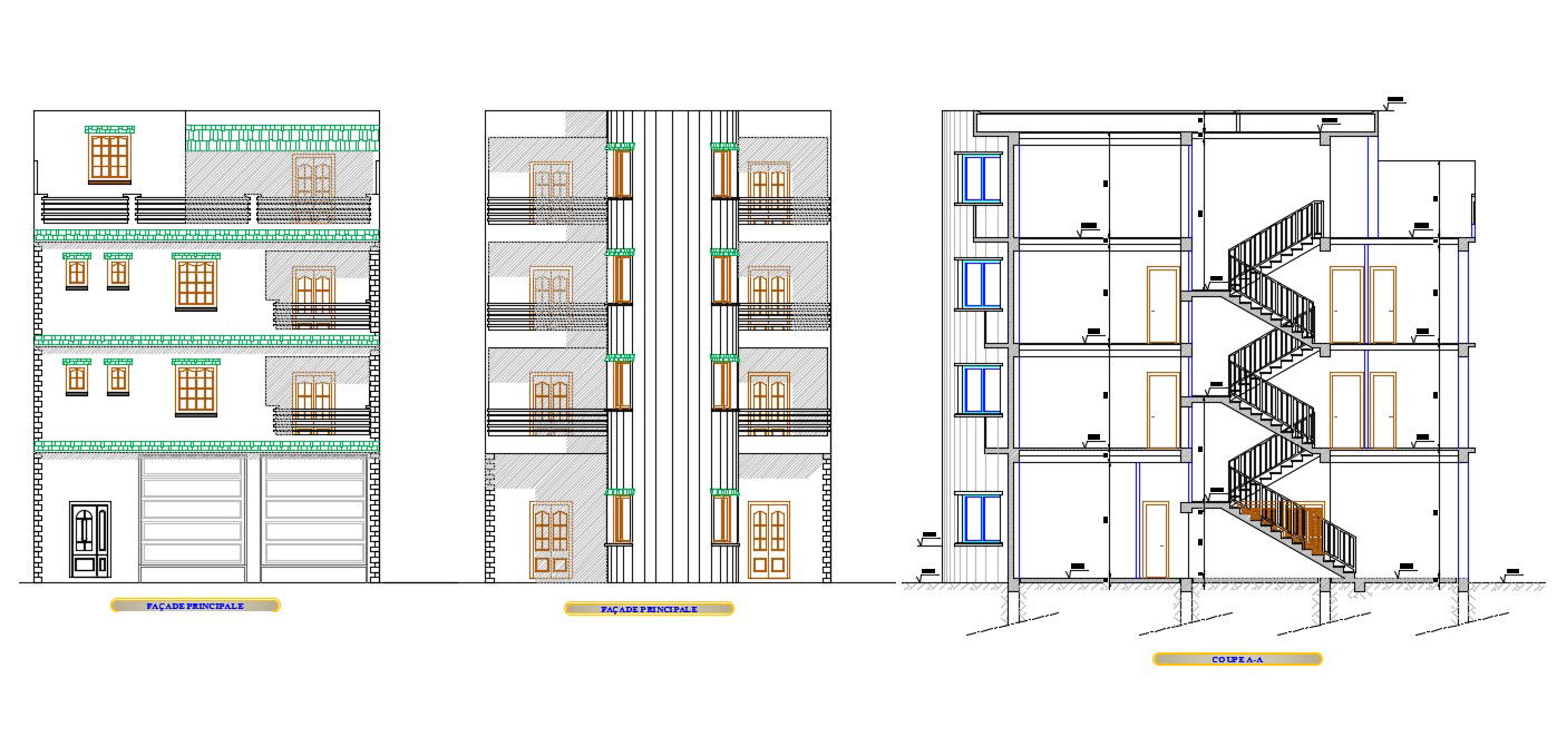 Multi Family Home Building Section And Elevation Design DWG File; the architecture multifamily home building elevation design and section drawing with foundation detail. download AutoCAD file of multi-family 4 storey building structure CAD Drawing.