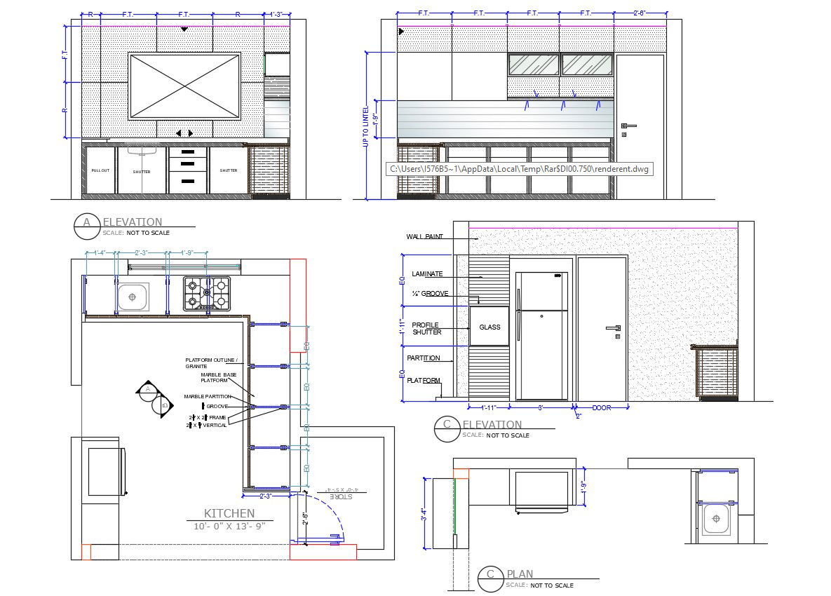 Modular Kitchen Interior Design Project AutoCAD File; the modular kitchen interior design CAD drawing shows elevation and floor plan includes marble base platform with under storage cupboard and drawer, 4 burner gas stove, refrigerator and sink design in AutoCAD format. download AutoCAD file of modular kitchen design DWG file.