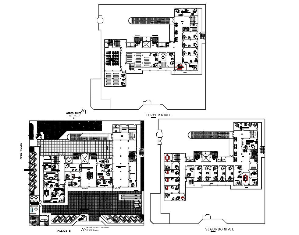 Three Floors Plan Of Office Building With Furniture Layout AutoCAD File