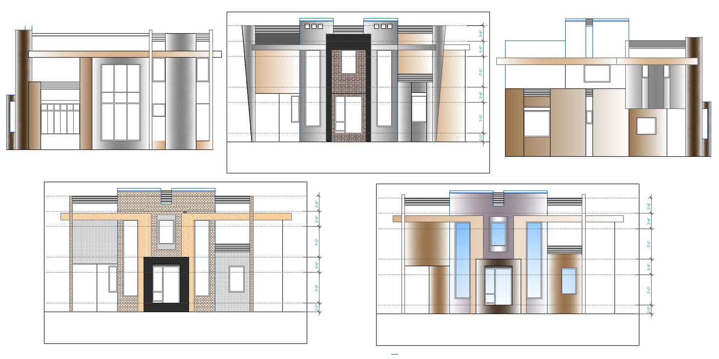 2D DWG File Best Huge Bungalow Elevation Cad Drawing;this is the modern four side elevation of the huge bungalow with basic shaded rendered in AutoCAD,floor levels dimension details,this is the modern architecture style elevation,and this is the CAD file format.