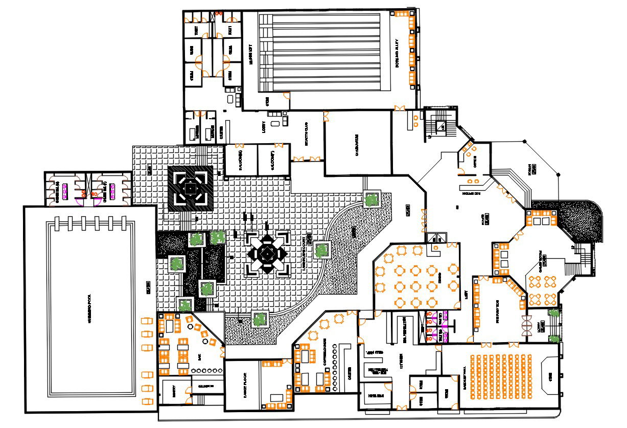 Architecture Club House Furniture Layout Plan AutoCAD File; the architecture layout plan has been designing in AutoCAD software, drawing showing clubhouse layout plan includes swimming pool, game zone, dance floor, salon, office lounge, hall, bar and restaurant with landscape court. download DWG file of clubhouse floor plan and use for CAD presentation.