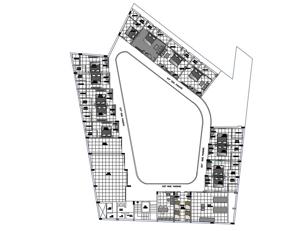 Ideas For 2d Cad Drawing Of Triangle Shape Hostel Room Floor Plan Autocad File; this is the modern planning of hostel room with flooring layout plan, furniture layout plan, in this planning added rooms with attached toilet and balcony, hall, kitchen, office, common toilet for his and her, store and much more other things related to hostel, its a DWG file format.