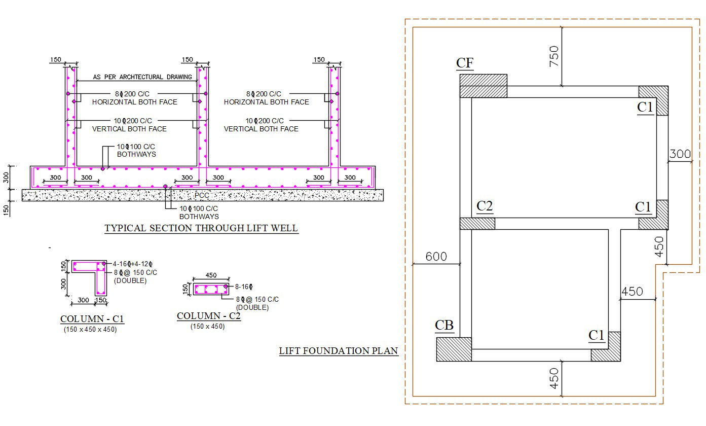 download free AutoCAD file of lift foundation layout plan and reinforcement wall and beam section drawing with all dimensions and necessary description details.