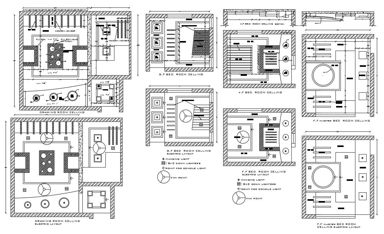 Learn How To Make Many Options Of Ceiling Design With Working Dimension Autocad File; this is the ceiling design of drawing-room, two-bedroom, master bedroom, includes working dimension, texting levels , some different hatching details related to ceiling, its a CAD file format.