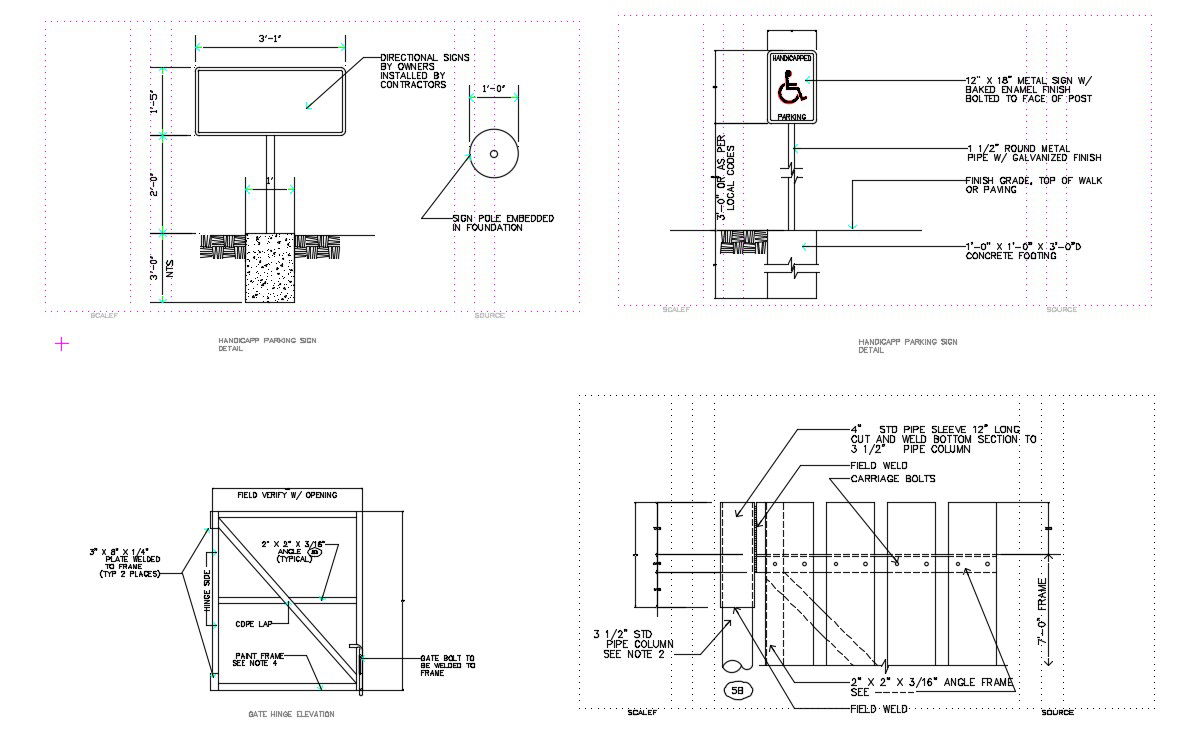 Tips For Draw Autocad Design Of Direction Sign With Working Drawing Cad File; this is the drawing of the direction sign with section, some structure details, pipe column details, texting details related to drawing and much more other details, its a DWG file format.
