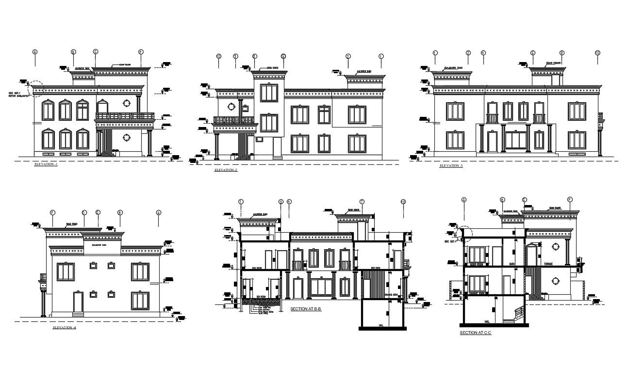 Tips For Best Huge Bungalow Four Side Elevation And Two Section Design Autocad File; this is the four side elevation of huge bungalow and two-section design, it's an ethnic style elevation with working dimension design, some floors levels dimension, texting details and much more other details, this is the CAD file format.