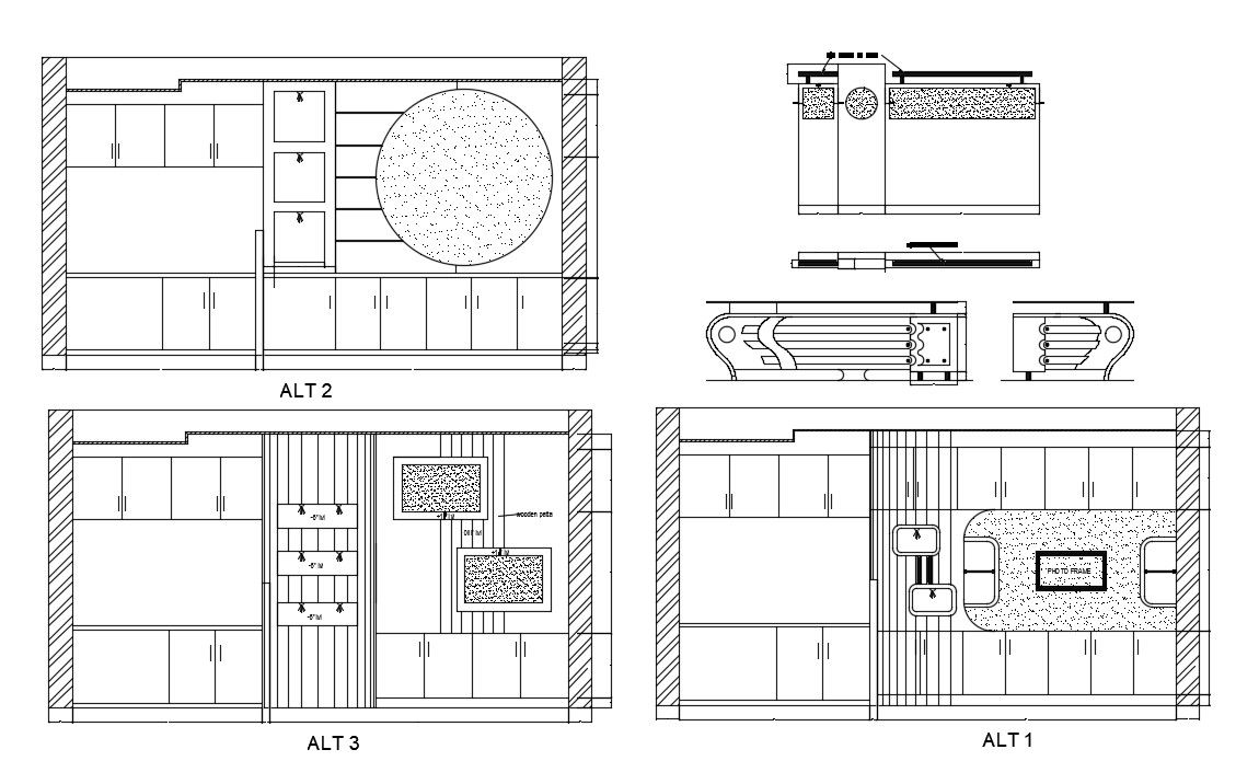 download free AutoCAD file of office furniture elevation design CAD drawing shows hanging cupboard, wall design and table elevation design with wall section detail.