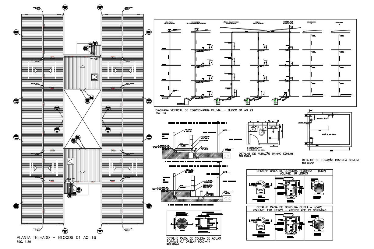 2d CAD Drawing details of roof structural layout plan along with roof framing structure, roof span design, dimension working set, sanitary toilet layout design, toilet sectional units, specification units, and various other details download AutoCAD file.