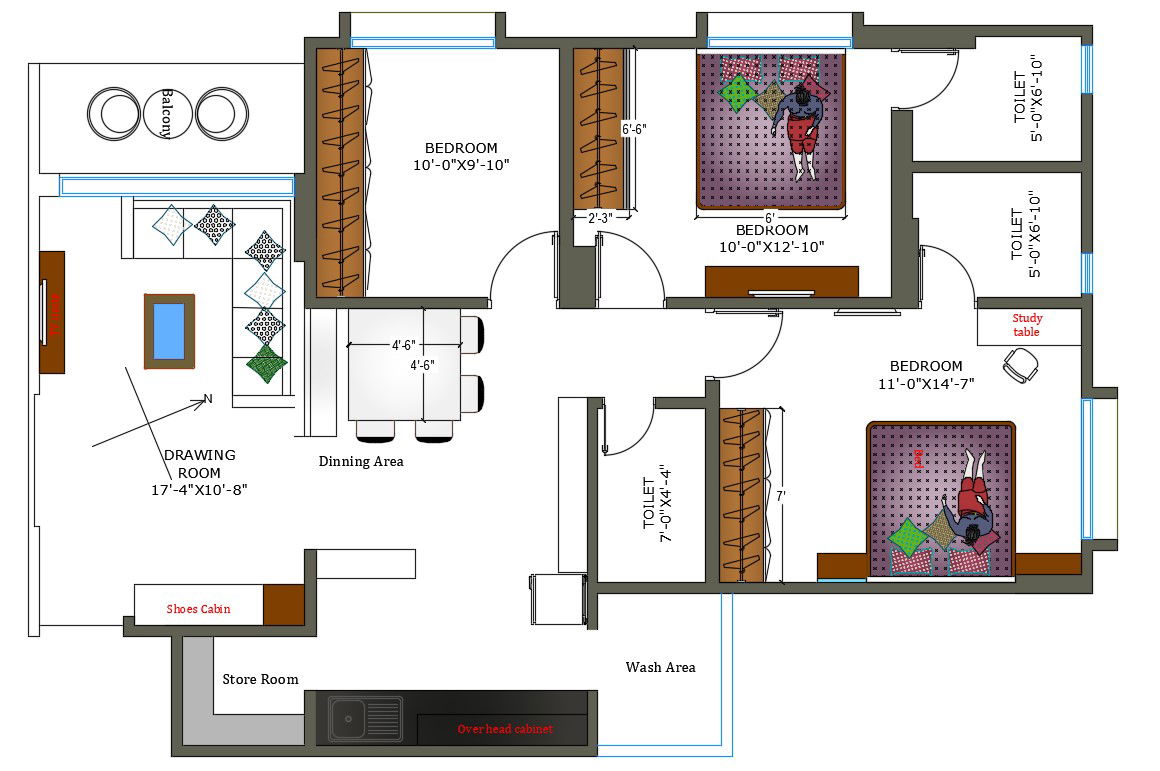 2D CAD Drawing 2bhk House Plan With Furniture Layout Design Autocad File; this is the 2bhk house plan with furniture layout design includes a drawing room, balcony, bedroom with attached toilet and common toilet, wash yard , kitchen , storeroom and much more other details in it, this is the DWG file format.
