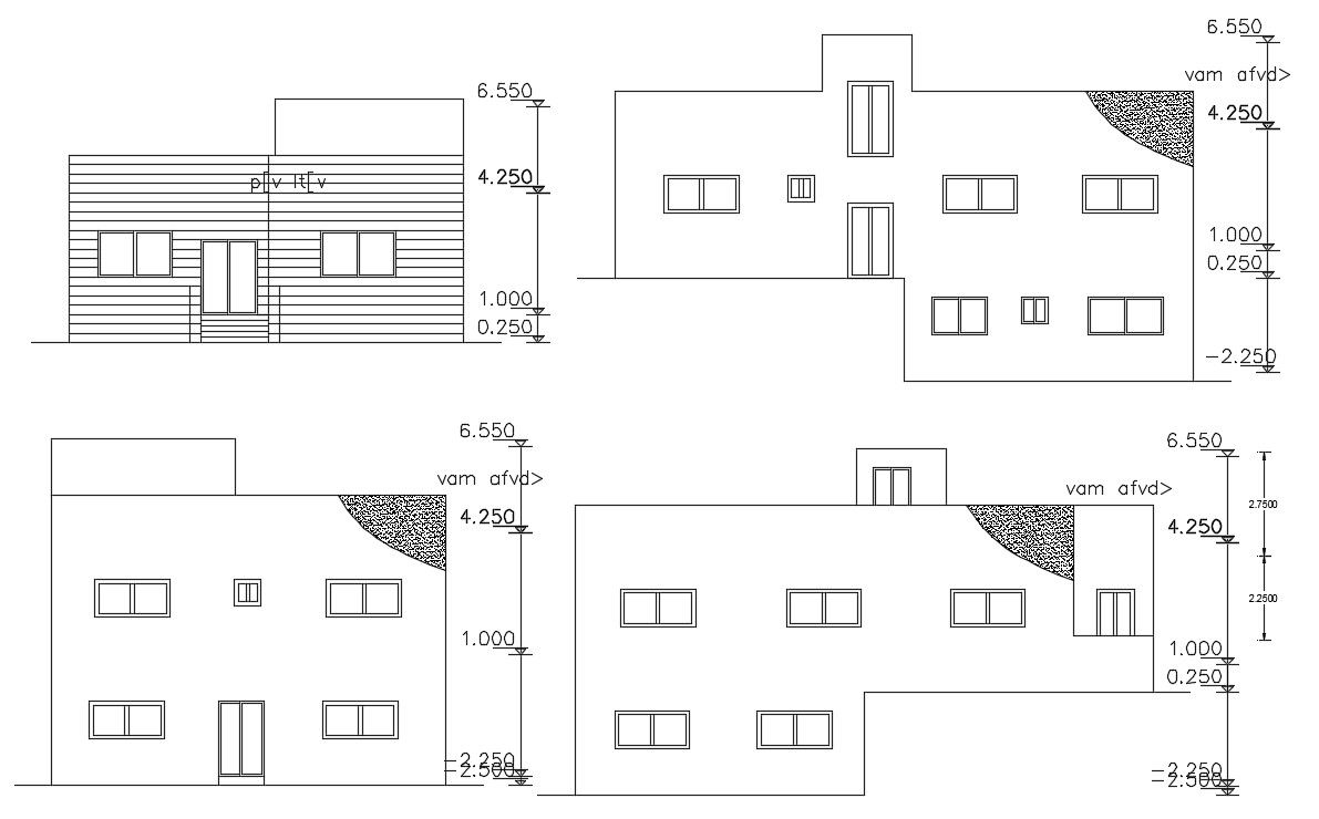 this is the simple house building elevation design with dimension detail CAD drawing shows wall, door, and window design.