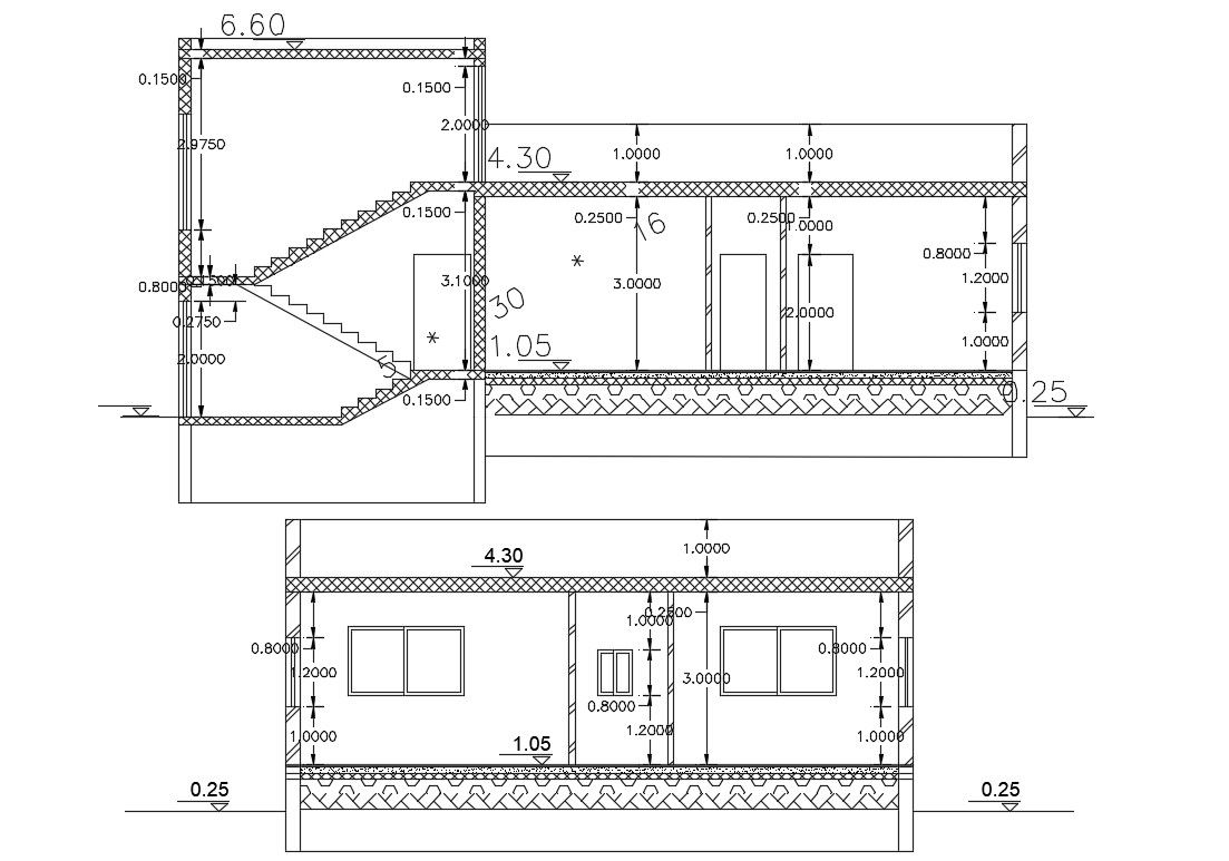 free download DWG file single storey house section CAD drawing shows wall, slab and staircase cross-cut section detail with dimensions.