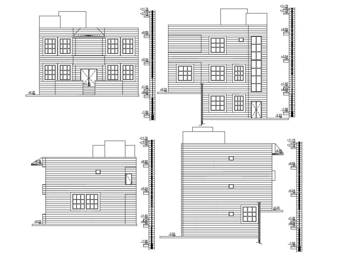 House Building Four Side Elevation With Floor Levels AutoCAD File