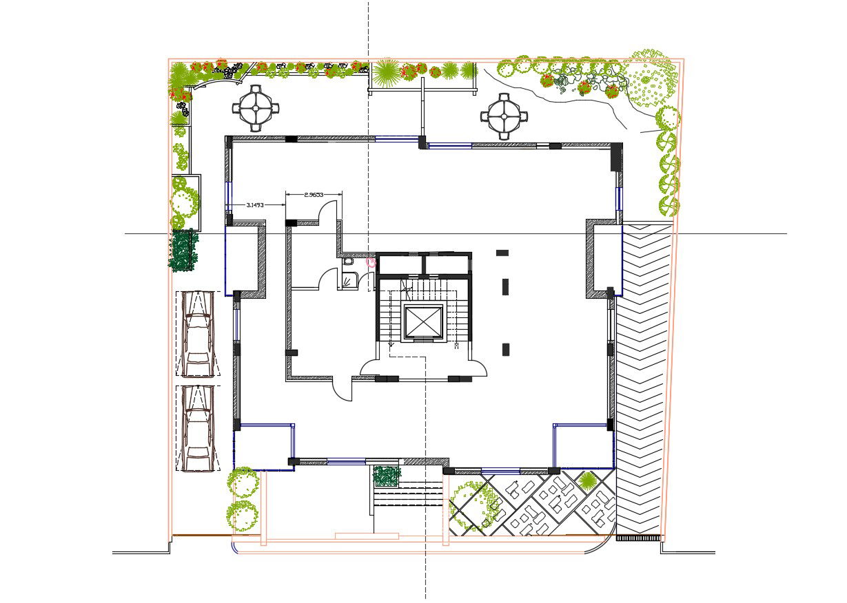 this is the planning ground floor of apartment design with parking, ramp details, landscape design, column demarcation in the plan, backside seating space, and much more other details related to building.