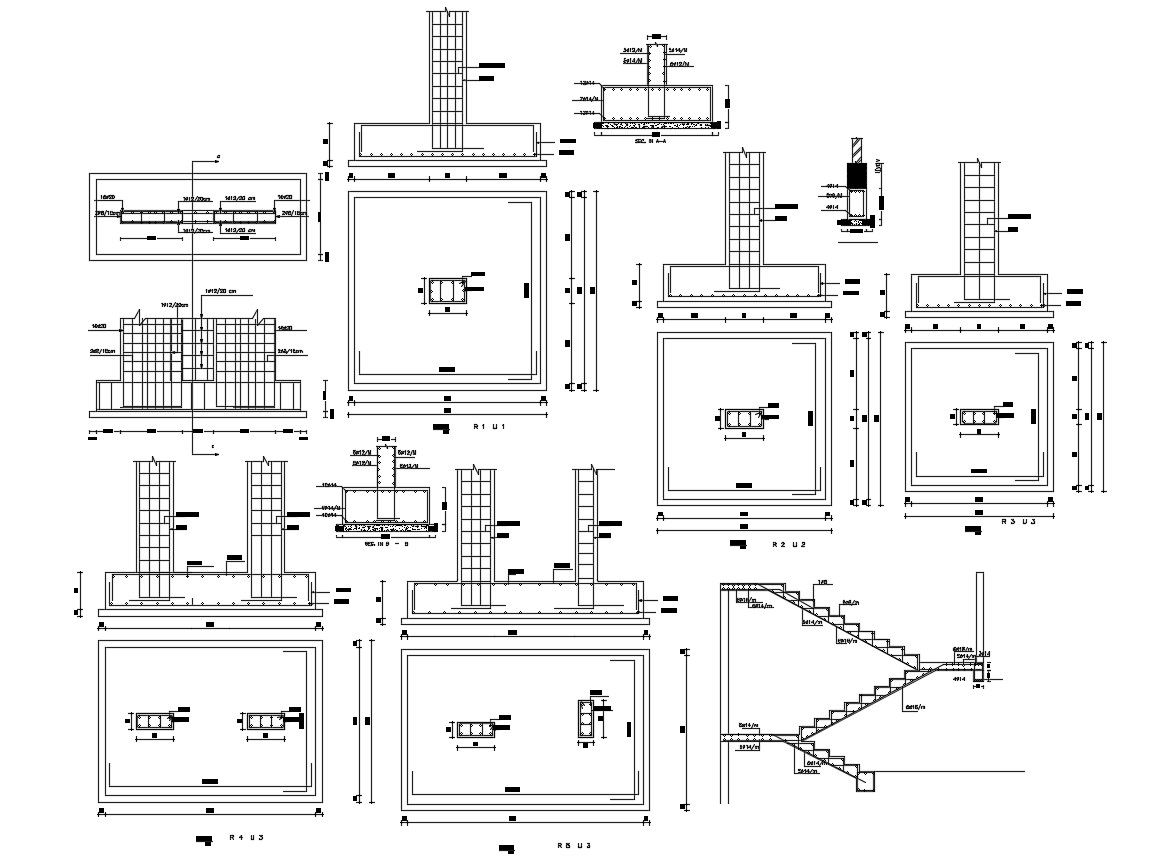 this is the structure details drawing of different types of column foundation details with stairs section details, reinforcement bars details, some dimension details related to foundation, also bar joints details.it's a structure details CAD drawing.