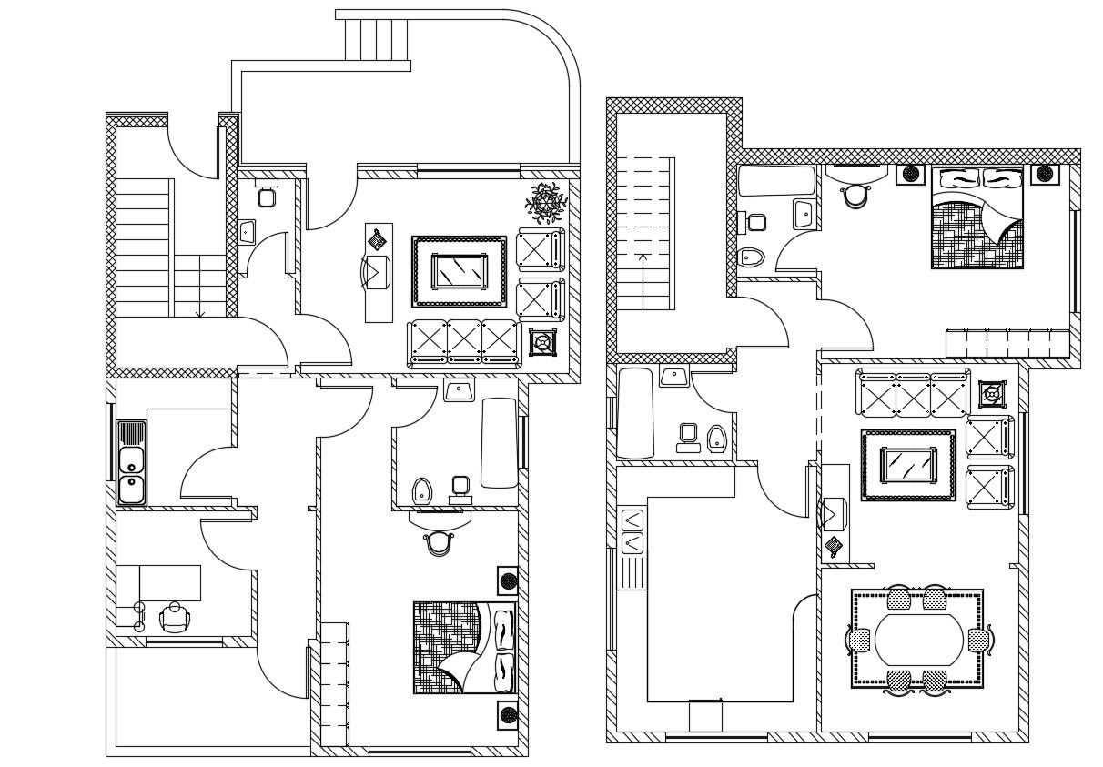 the architecture residence house ground floor plan and first-floor furniture layout plan CAD drawing includes master bedrooms, drawing room, living room, dining area, and kitchen. download house furniture layout plan DWG file for use CAD presentation.