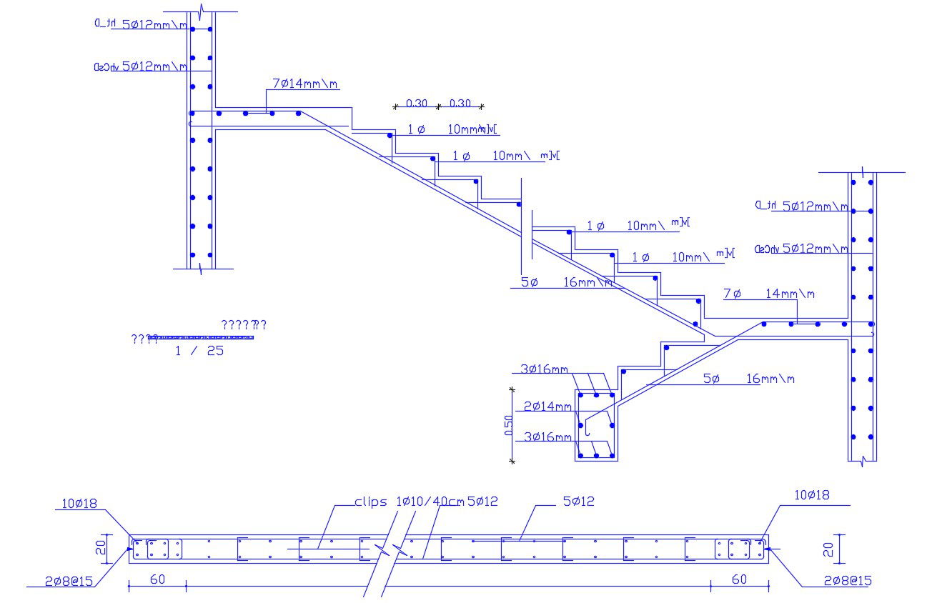 This the RCC Reinforced staircase section CAD drawing shows a number of risers and treads with steel reinforcement bars size detail. download free DWG file of staircase design.