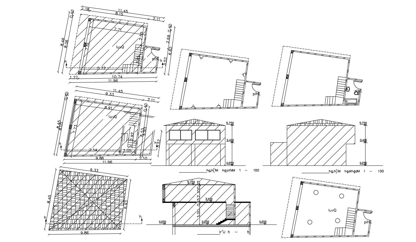 this is the single hall floor plan with stair section, elevations, top roof floor plan, working drawing dimension details, it's a sloping roof elevation, floor level marking and other more details related to building.