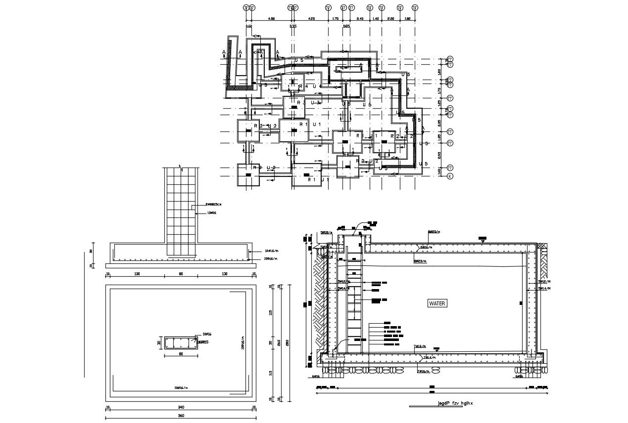 this is the drawing of the apartment foundation with centerline plan, working dimension details, reinforcement details of column, underground water tank details with RCC wall design.