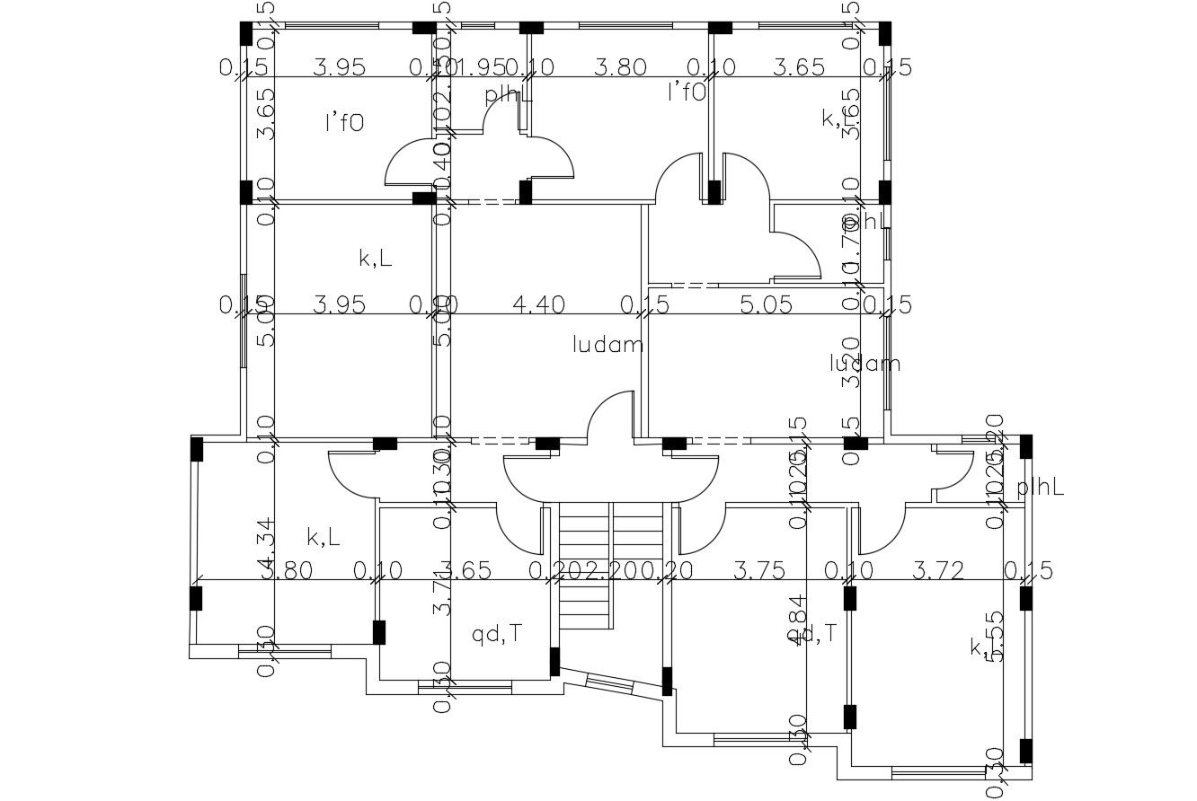 this is the simple drawing of residential building with structure column demarcation details. working drawing dimension details.