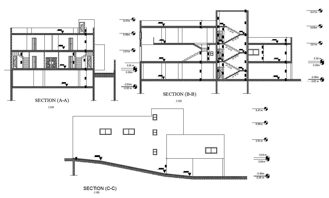 3 Storey House Building Cross Section And Elevation Design DWG File