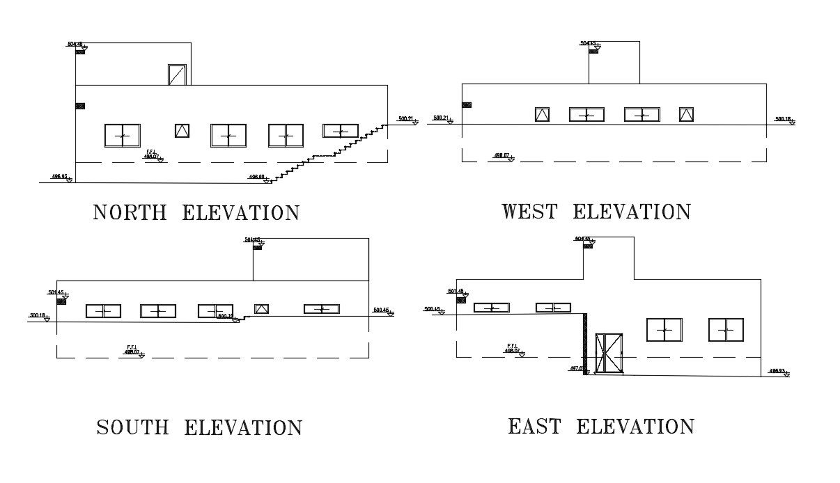Download free DWG file of single storey house elevation design with dimension detail in AutoCAD format. this drawing drafted in AutoCAD software format.