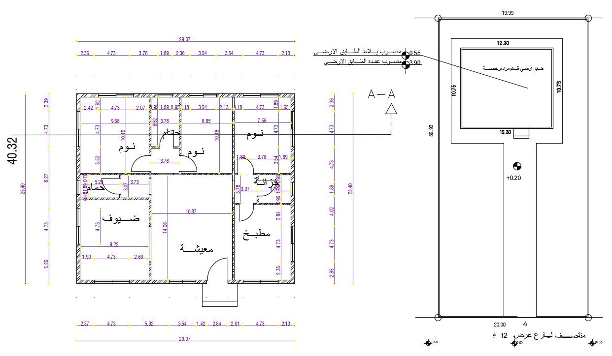 2d AutoCAD drawing of residence ground floor plan with dimension detail. it also shows the final site town plan for construction the building design. download a simple house plan DWG file.