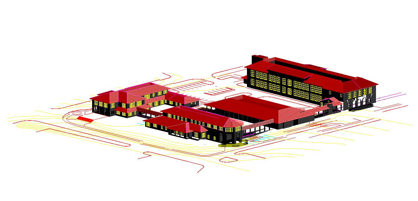 Download 3d model of college building isometric elevation design shows building blocks, land, road network, and playground.
