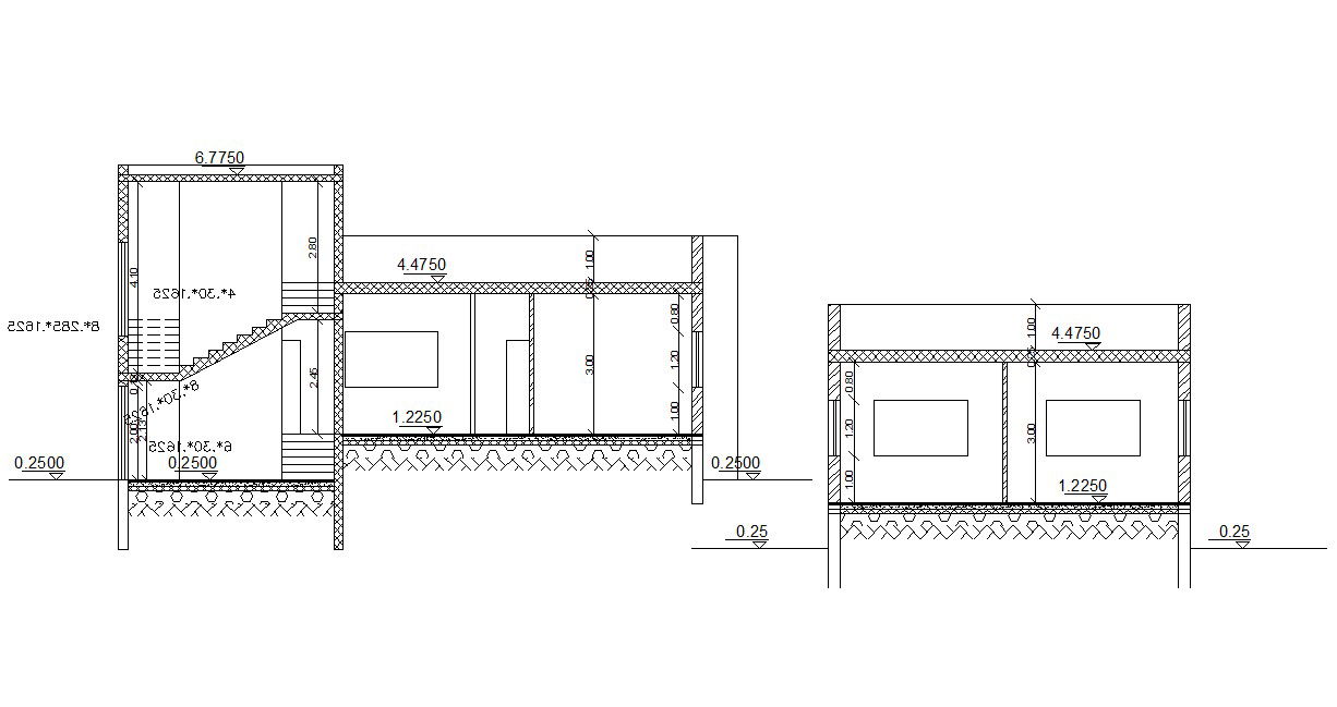 this is the structure two sections of single-story home design with working drawing dimension, floor levels, stairs section details, parapet. it's a DWG CAD file format.