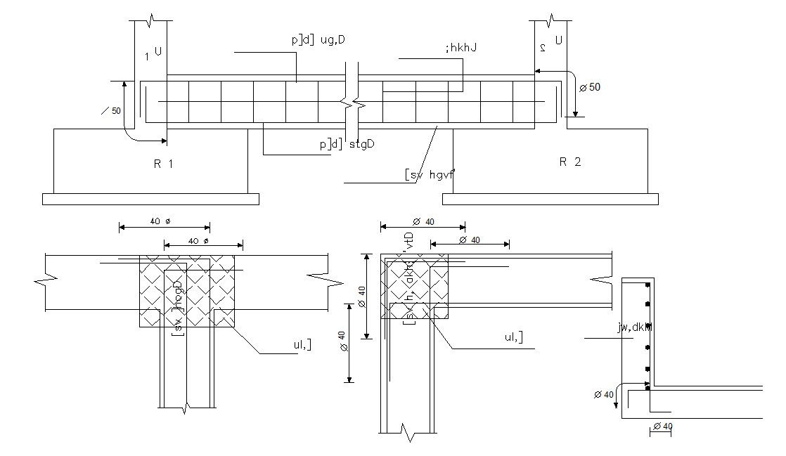 this is the footing and beam details with bars dimension and texting, some calculation of bars, column foundation simple design, beam section and its a structure related drawing DWG file.