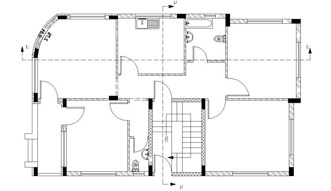apartment planning with column structure design, DWG drawing of architecture plan, toilet sanitary details, stair design.it's a simple two-bedroom flat design download the dwg file.