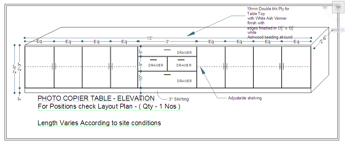 This table block detail in 19 mm Double ply table top made use with venner, 3†skirting, adjustable shelving, lay-out plan design.